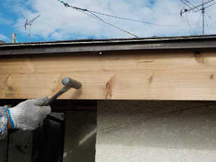 新しい板を張りカサギトタンを被せ取り付け固定し釘部分にシーリング処理を施工