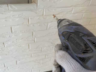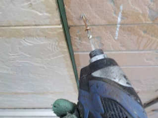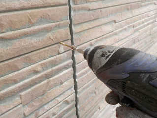 外壁サイディング塗装前の下地処理、旧シーリングの撤去後に浮きに対してネジを使い締め付け作業を行います